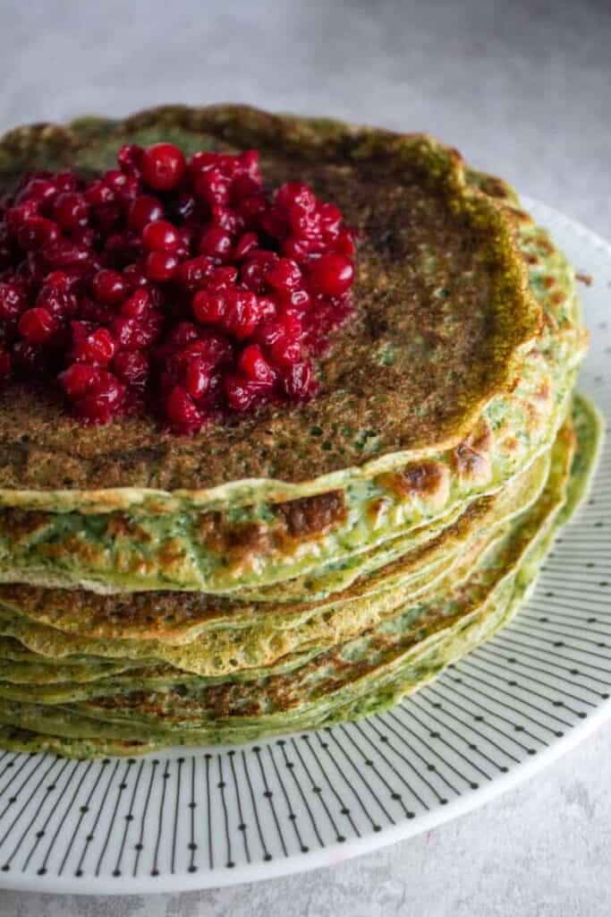 In Finland, it’s customary to serve spinach crepes with lingonberry mush or jam. But my kids prefer to have strawberry jam with them, so feel free to serve these crepes with any jam you like 😄